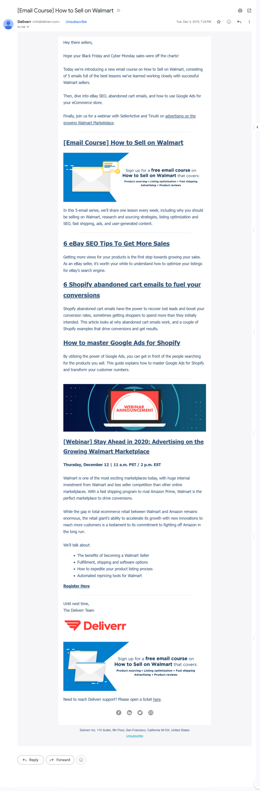 Email course announcement bundled into Deliverr's weekly newsletter alongside SEO content, abandoned-cart content, and a Walmart Marketplace webinar promo.