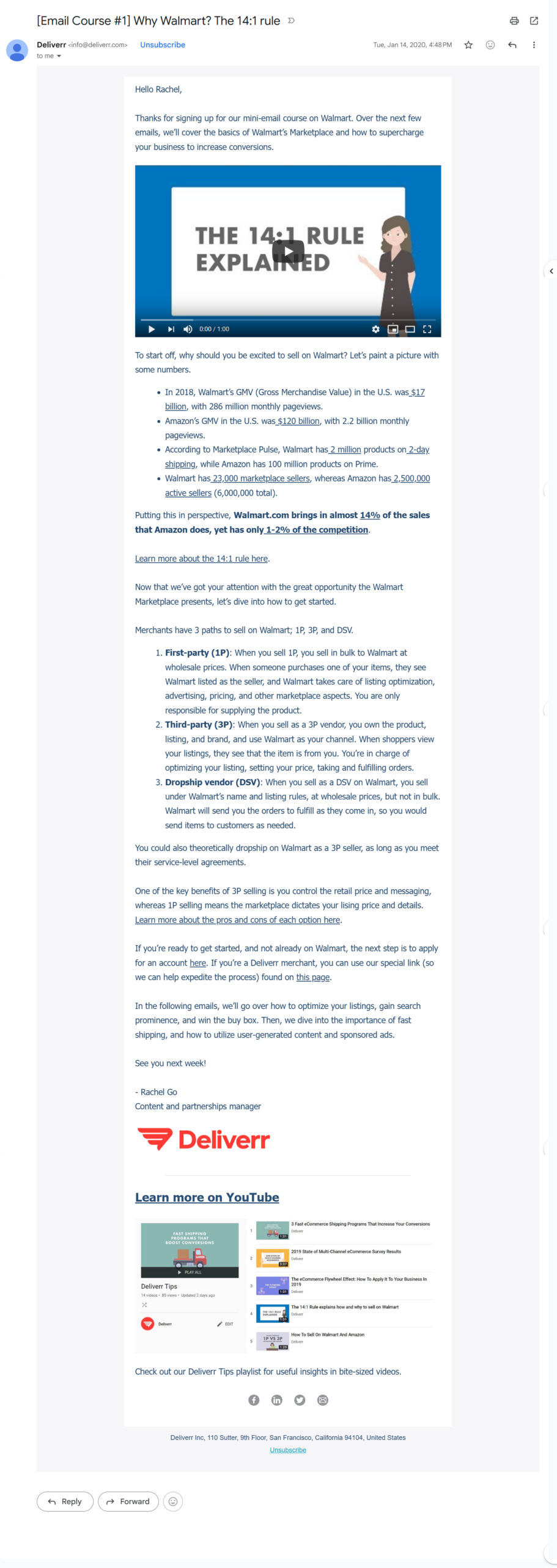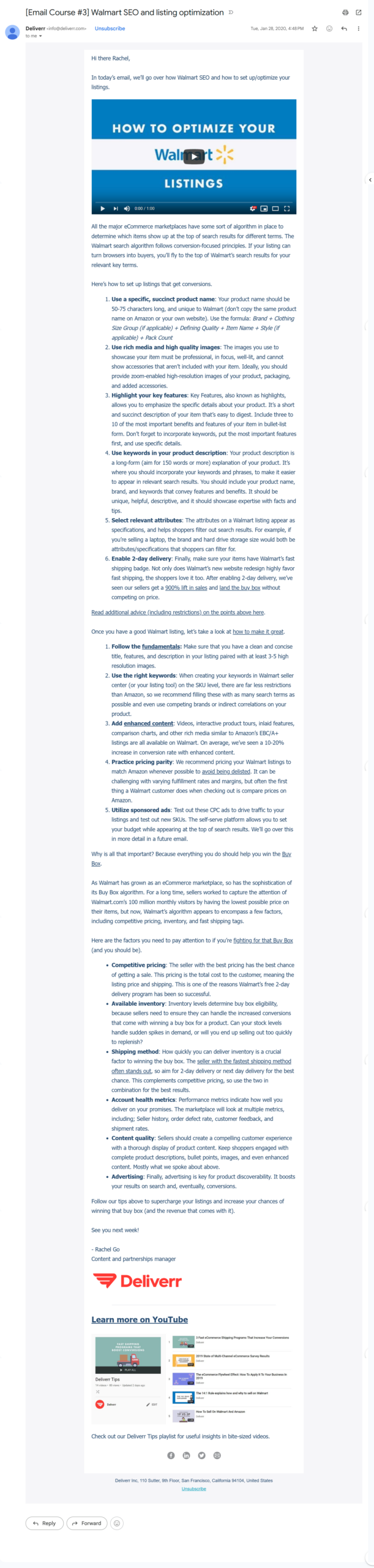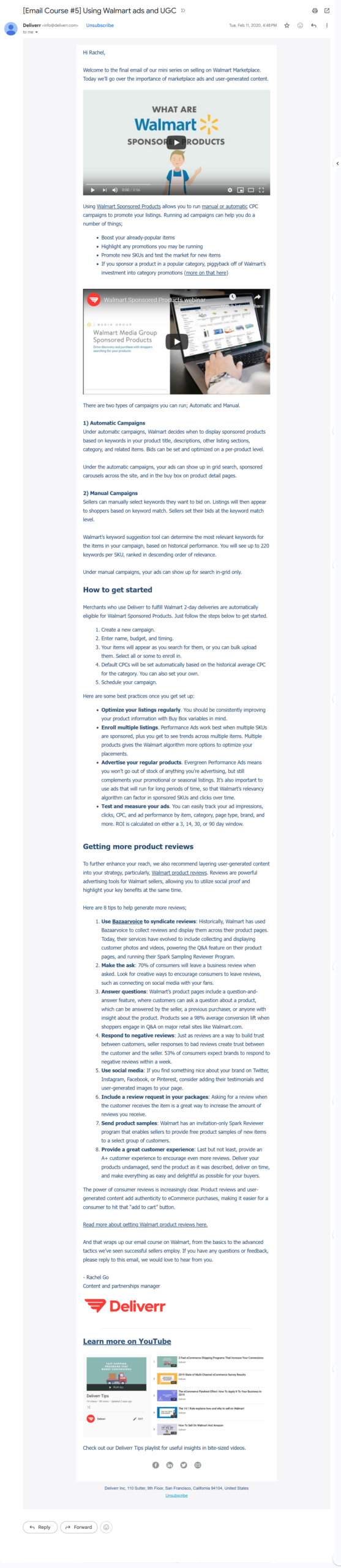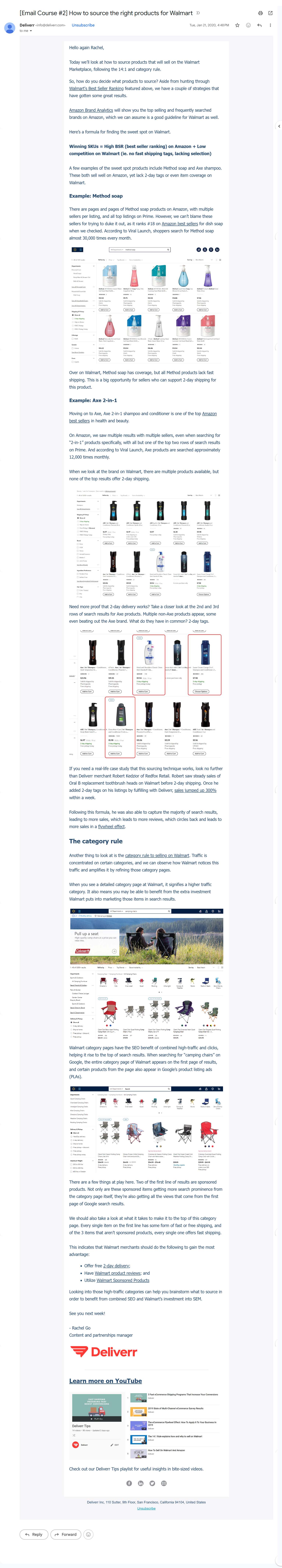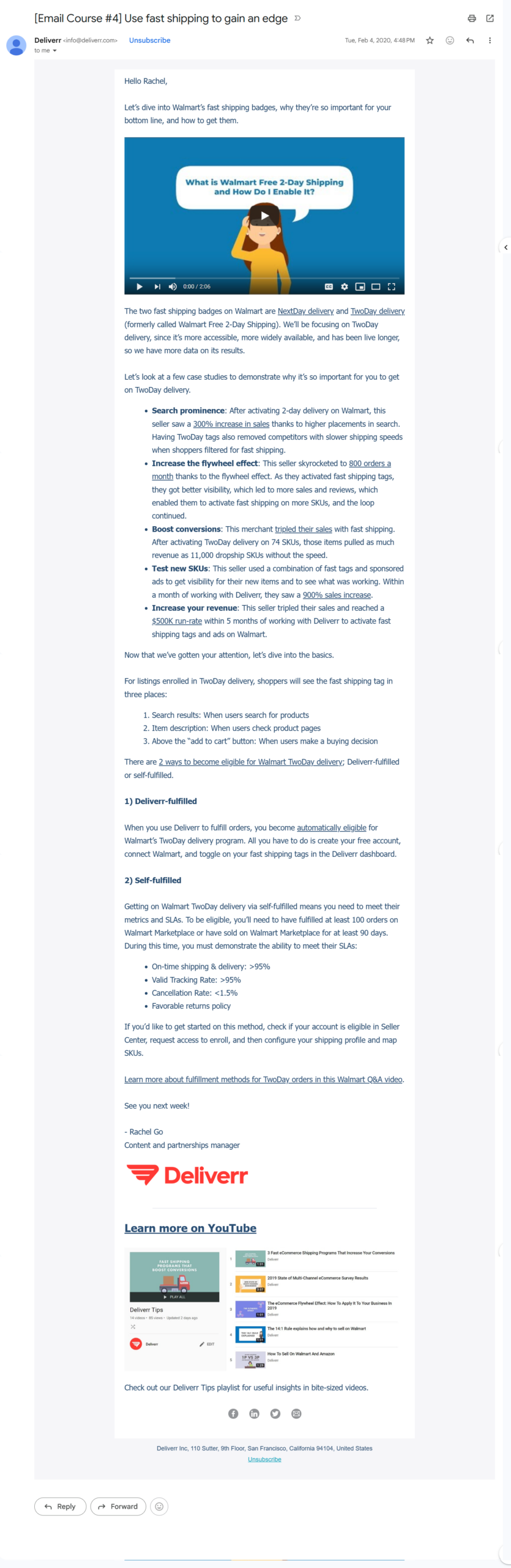 Course shipped during Rachel’s tenure as Deliverr’s first marketing hire (2018–2021). Email screenshots archived from the original sends.