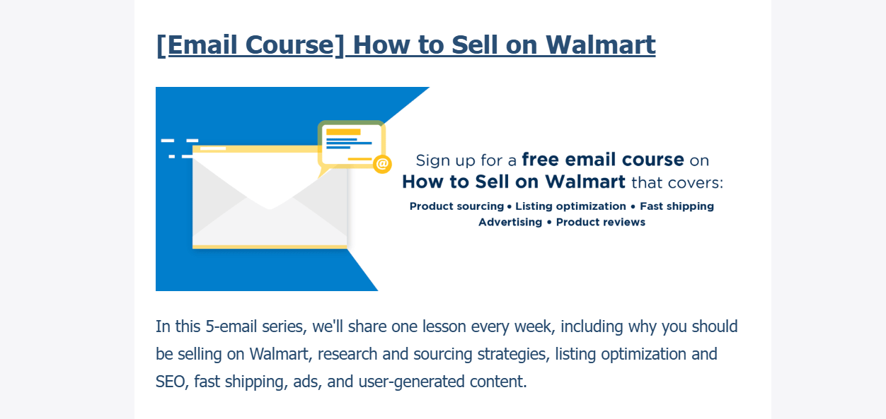 A 6-part email course, sequenced as a learning path for the seller who wanted to start on Walmart but didn’t know where to begin: